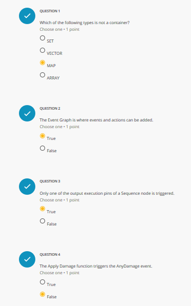 Choose one 1 point. Choose one -1 point True O False QUESTION 4 The Apply Damage function triggers the AnyDamage event. Player who shot the weapon Damage Causer.
